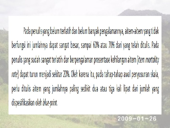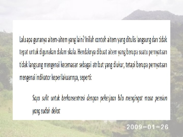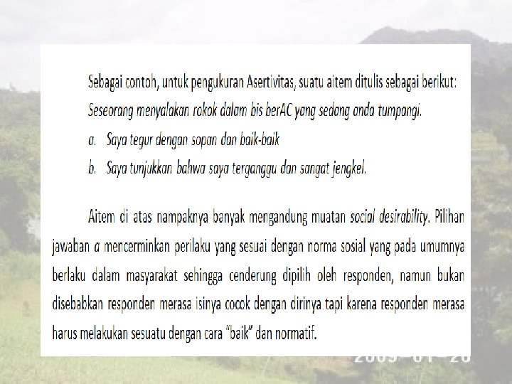 • Perhatikan bahwa isi aitem tidak boleh mengandung social desirability yang tinggi, yaitu aitem yang isinya sesuai dengan keinginan sosial umumnya atau dianggap baik oleh norma sosial. • Aitem yang bermuatan social desirability tinggi cenderung akan disetujui atau didukung oleh semua orang semata-mata karena orang berfikir normatif, bukan karena isi aitem intu sendiri dengan perasaan atau keadaan dirinya.