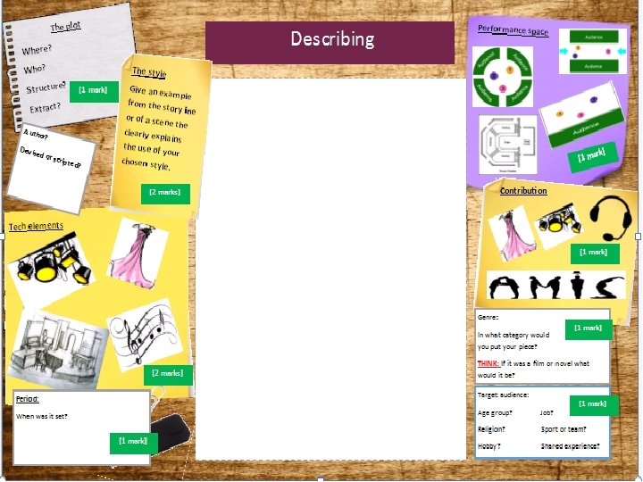 What was it about? narrative structure stage directions physical theatre melodrama location ensemble social context satire monologue Style Audience commedia period drama documentary gasping surprised Atmosphere special effects relaxed lights nostalgic Foreboding buzz sound set Technical elements costume make-up sombre tableaux verbatim character profile hot seating Rehearsal techniques freeze frames role reversal Choral speech still How was it created? humorous task and tactic thought tracking Angel and Devil eerie tense Does it compliment the style? Plot? fantasy + Acting skills = Engaging Performance historical contemporary role on the wall facial expressions who was your target audience? political satire Genre tragedy alienated verbal feedback horror fairy-tale T. I. E How does it fit with elements of the storyline? crying laughter comedy non-naturalistic physical theatre relationships stimulus narrator attentive silence naturalistic montage Storyline period musical improvisation How did it fit with the acting/style of the play? conscience alley research angel and devil split stage in the round ensemble in-traverse freeze frames Performance/staging promenade techniques proscenium direct address unison end-on monologue thrust arch sound scape