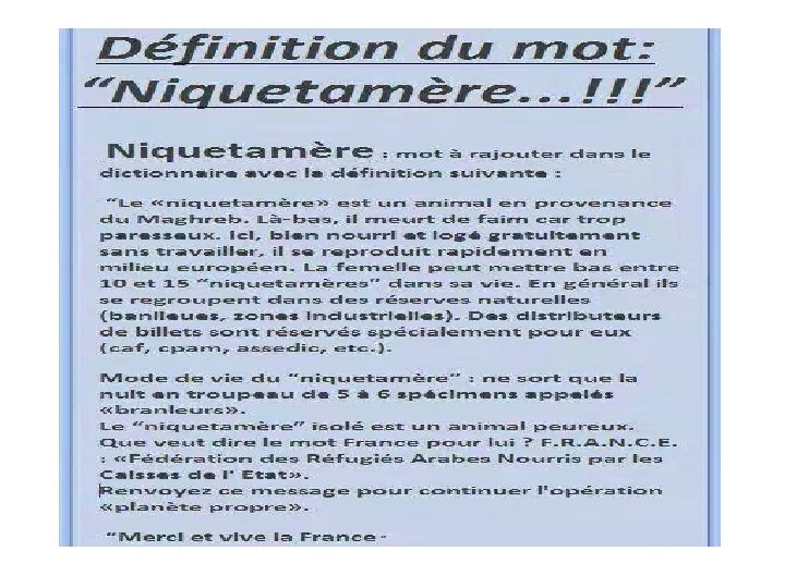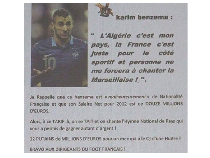 Voici la photographie du "plus grand imbécile au monde" que certains de nos "politiques" occultent et choutent pour gagner des voix lors des prochaines élections. Voilà ce qui nous est réservé dans les années à venir avec leur "politiquement correct", car nous avons les mêmes dans nos banlieues, mais Chutttttt, faut pas l’dire Croyez-vous réellement à l'assimilation de tels crétins? Si oui, allez vite consulter, c'est très grave. . . !