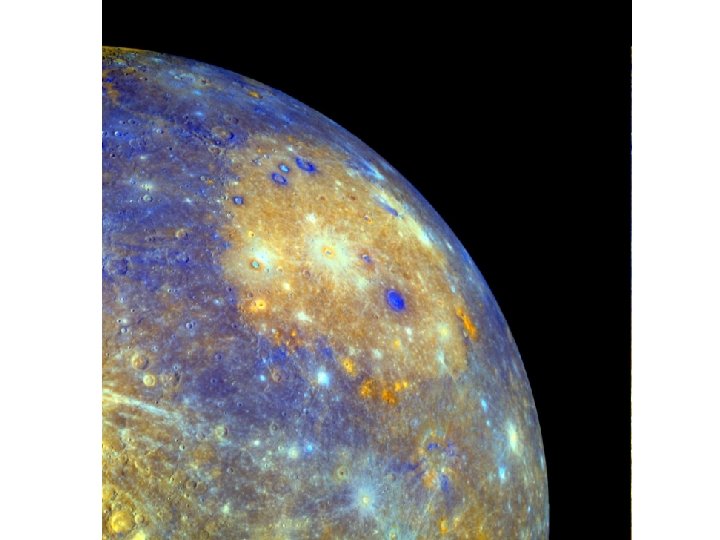 Mercury’s Surface Highly cratered with smooth terrains. Relatively ancient, volcanic surface. Similar to Earth’s Moon, but fewer craters and more “plains”. Geologically longer active than Moon? Plains mostly lava or impact ejecta?