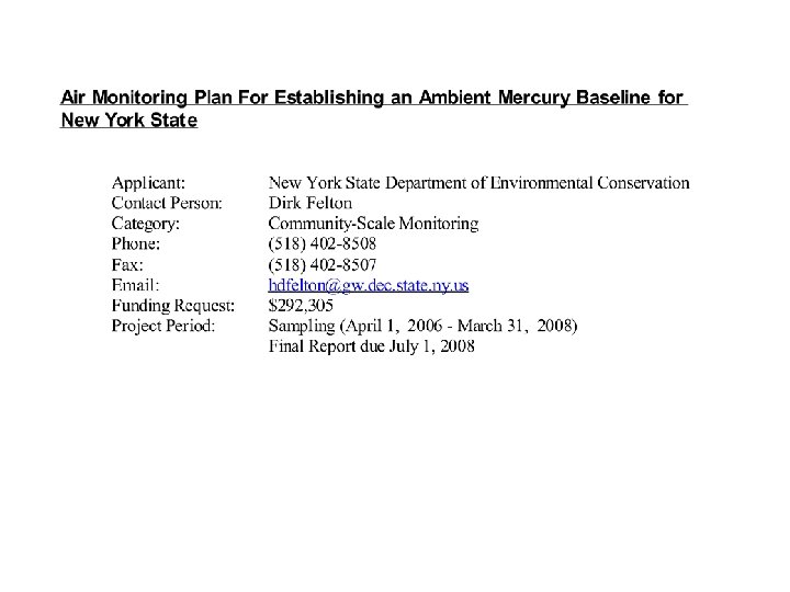 Specific objectives to be achieved with the MTN are to: · Determine the status and trends in the concentrations of ambient air mercury species: Reactive gaseous (RGM) Particulate bound (PHg) Elemental (Hg 0) Wet, dry and total atmospheric deposition of mercury · Operate MTN stations to monitor the status and trends in mercury deposition for ecosystems that are influenced by local, regional, continental and global scale mercury sources. The priority will be to establish MTN stations to evaluate the efficacy of forthcoming mercury emission changes from implementation of state and federal regulations · Evaluate the status and trends in total deposition of atmospheric mercury to ecosystems with a high potential for mercury methylation and mercury bioaccumulation in fish and wildlife. · Provide the capability to link changes in mercury emissions to changes in atmospheric mercury concentrations and total deposition of atmospheric mercury · Improve the information base for models of atmospheric mercury chemistry, transport, and deposition