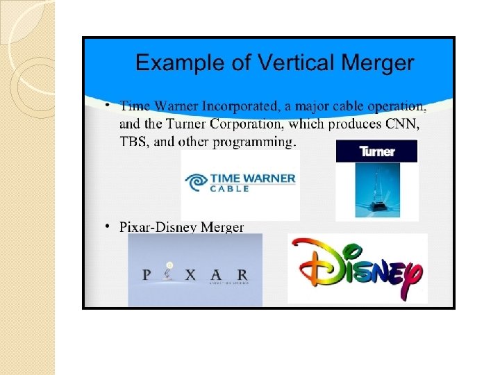 Different Types of Mergers Horizontal Merger • When two companies merges together which offers the same product lines and services to the final customer, which means that it is in the same industry and the same stage of production. • It helps in achieving economies of scale and also encourage cost efficiency. Vertical Merger • Vertical mergers is done with an aim to combine two companies that are in the same value chain of producing the same good and service, but the only difference is the stage of production at which they are operating. • They help in ensuring the secure supply of essential goods and avoid disruption in supply • They also help in cost saving and a higher margin of profit, since the manufacturer’s share is eliminated.