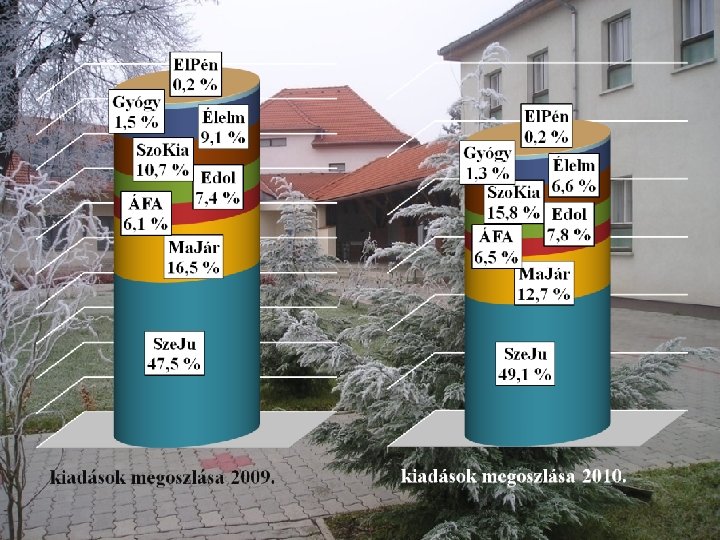 Az intézményi bevételek 30%-a származik a NÁH-ból, amely összegnek a 60, 9 %-a kerül visszafizetésre a bér járulékai és ÁFA formájában (2010. évi beszámoló)! Intézmények kiemelt dologi kiadások - arányok 2010. 29% 30% Élelmiszer (vásárolt élelmezéssel együtt) Gyógyszer beszerzés Közüzemi kiadások 35% 6% ÁFA kiadások