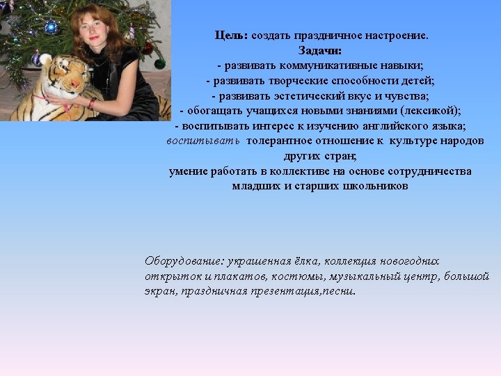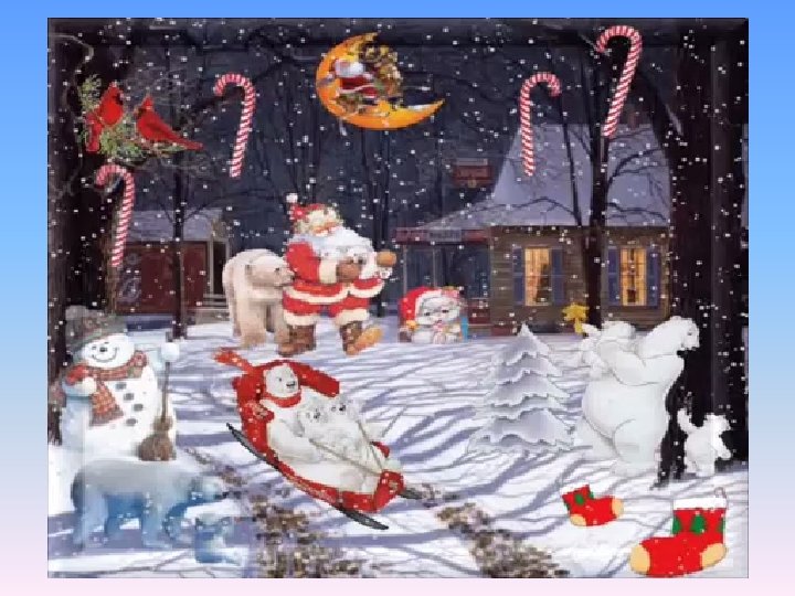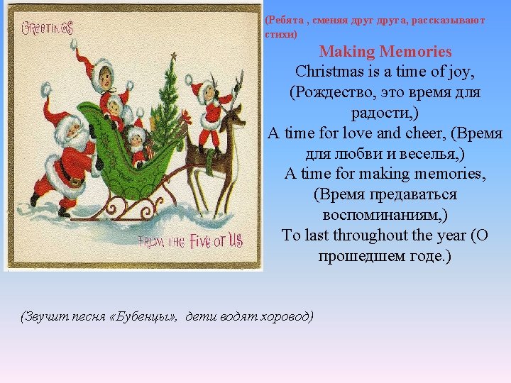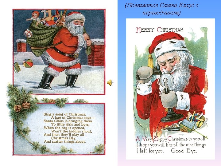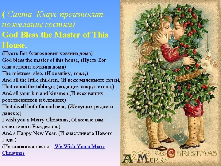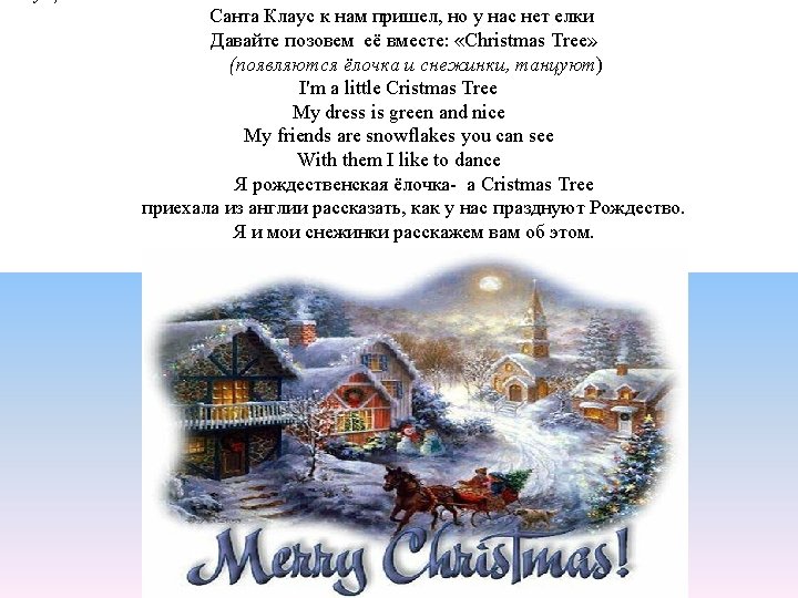 Звучит песенка « The Christmas Song» Chestnuts roasting on an open fire Jack Frost nipping at your nose Yuletide carols being sung by a choir And folks dressed up like Eskimos Everybody knows a turkey and some mistletoe Help to make the season bright Tiny tots with their eyes all aglow Will find it hard to sleep tonight They know that Santa's on his way He's loaded lots of toys and goodies on his sleigh And every mother's child is gonna spy To see if reindeer really know how to fly And so I'm offering this simple phrase To kids from one to ninety two Although its been said many times many ways Merry Christmas to you