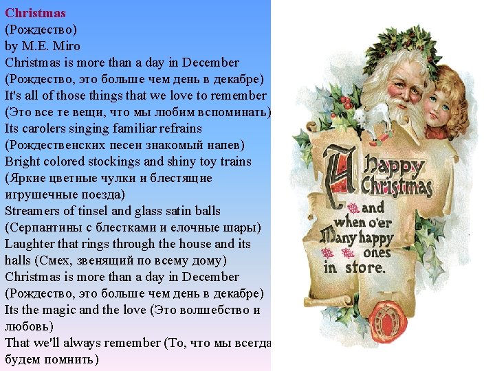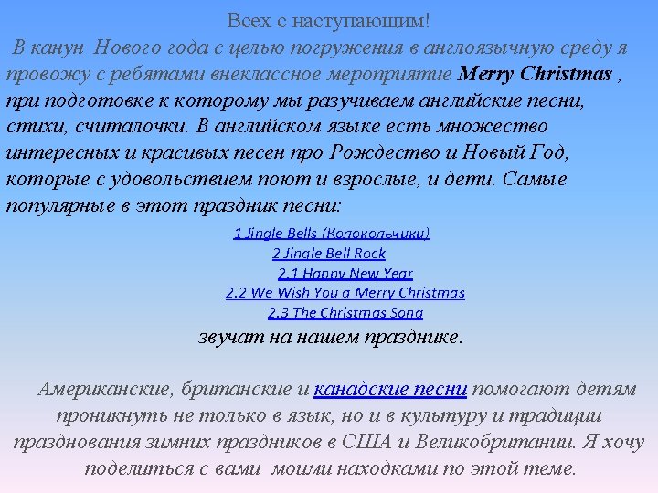Good morning, my dear children. I want to congratulate you on Christmas. I wish you New things to learn, new friends to meet, New songs to sing, new books to read, New things to see new things to hear, New things to do in this glad New Year. I want to give you lots of love And want to say right here. Have a Happy New Year day And then a Happy Year. Я хочу сейчас сказать, Что желаю Вам добра, Много веселья, улыбок и смеха, Счастливого Нового Года И волшебного Рождества!