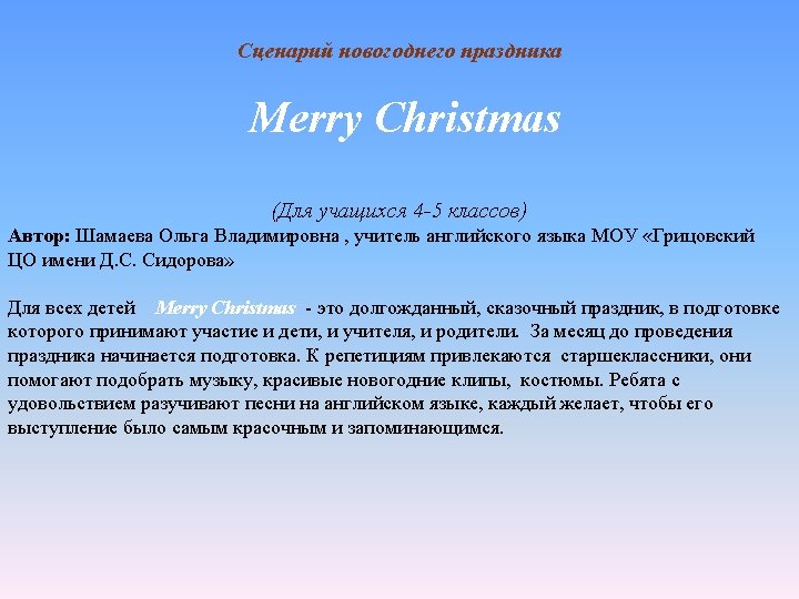 ( Все вместе выкрикивают) Happy New Year for me, Happy New Year for you, Happy New Year for everyone. That’s what I wish – I do! Good bye, dear children! Звучат песни «The Christmas Song» , « Happy New Year»
