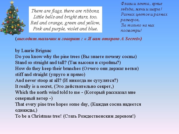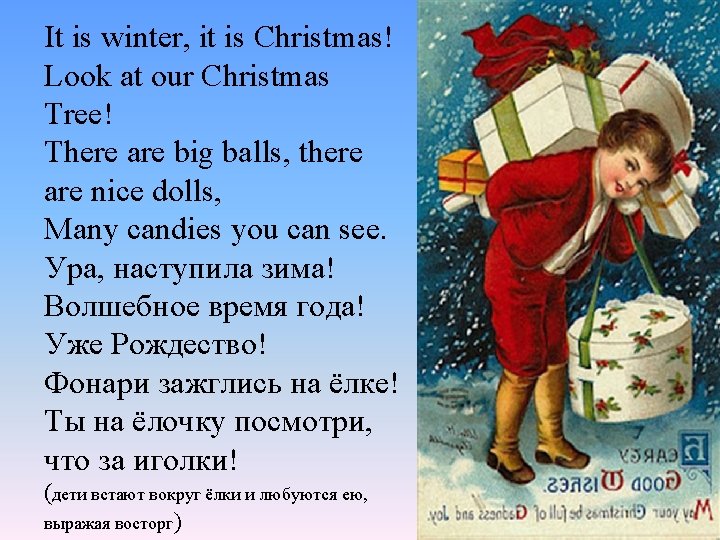 ведущие Ребята, посмотрите какая у нас красивая елка Кто знает стихотворение о елке? (дети читают стихотворения) It is winter, it is Christmas! Look at our Christmas Tree! There are big balls, there are nice dolls. Many candies you can see. There are flags, there are ribbons, Little bells and bright stars, too. Red and orange, green and yellow, Pink and purple, violet and blue.