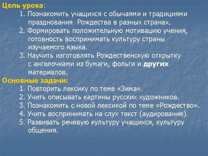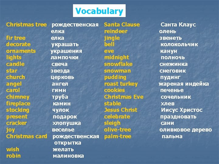 The 25 th of December is the great religious holiday. It is the day that Christians celebrate the birth of Jesus Christ - Иисус Христос Christians – христиане religious - религиозный celebrate - праздновать
