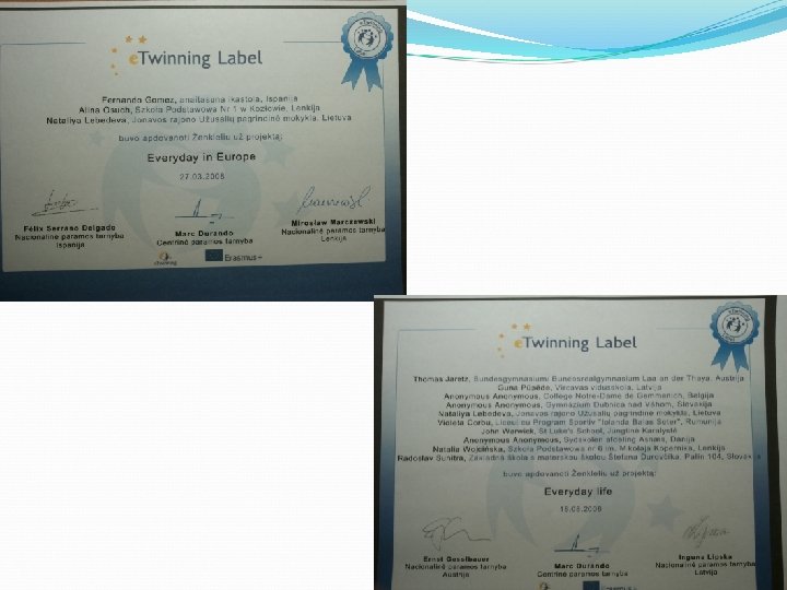 Everyday life Projektas pradėtas 2008 m. rugsėjo 1 d. Projektas užbaigtas 2009 m. rugpjūčio 8 d. Trukmė-mokslo metai Projekto tikslas: keistis informacija ( nuotraukos, plakatai, vaizdinė medžiaga) su įvairių Europos Sąjungos šalių mokiniais ir jų mokytojais apie mokinių gyvenimą, mokyklų tradicijas, šventes.