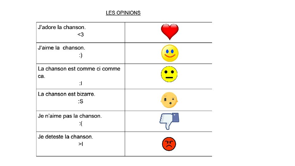 Opinions JJJJJ J’adore JJJJ J’aime beaucoup JJJ J’aime bien JJ J’aime assez L Je n’aime pas beaucoup LL Je n’aime pas LLL Je n’aime pas du tout LLLL Je déteste I prefer Je préfère I would prefer Je préférerais