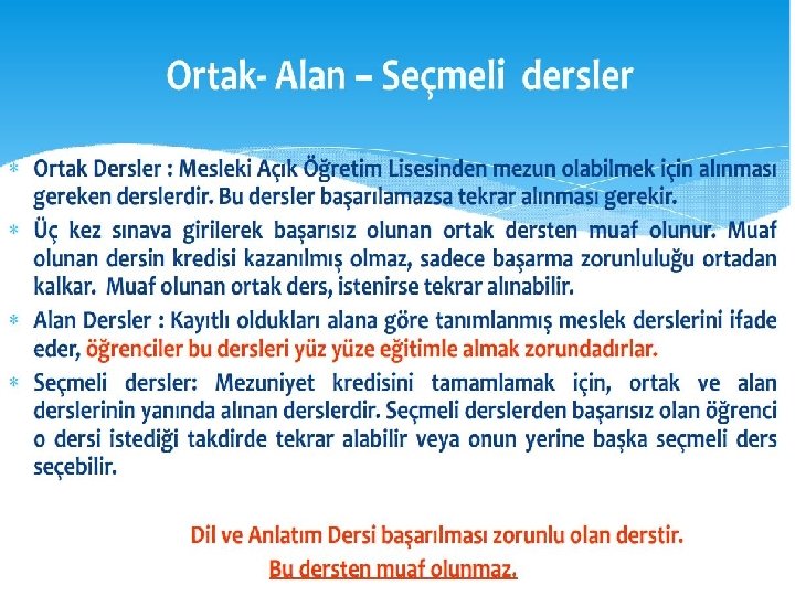 ORTAK DERSLER Mesleki Açık Öğretim Lisesinden mezun olabilmek için alınması gereken derslerdir. Bu dersler başarılamazsa tekrar alınması gerekir. Üç kez sınava girilerek başarısız olunan ortak dersten muaf olunur. Muaf olunan dersin kredisi kazanılmış olmaz, sadece başarma zorunluluğu ortadan kalkar. Muaf olunan ortak ders, istenirse tekrar alınabilir. Dil ve Anlatım Dersi başarılması zorunlu olan derstir. Bu dersten muaf olunmaz.