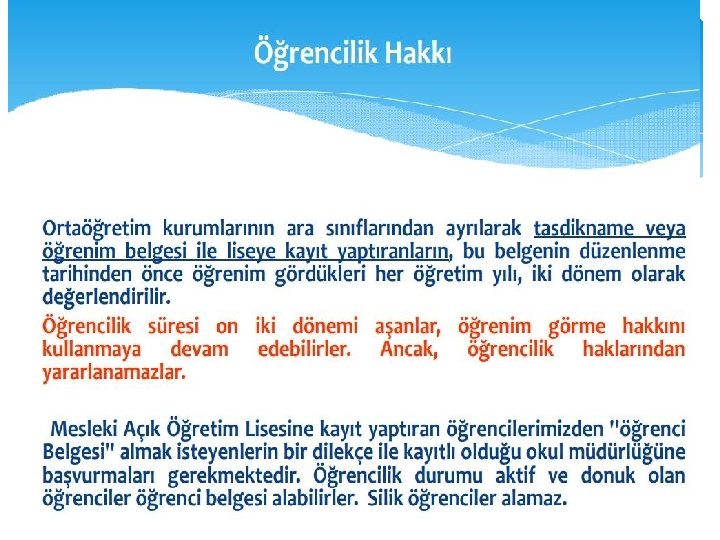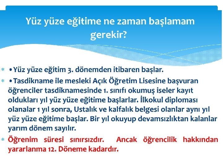 MEZUN OLMA Öğrenci gerekli olan dönemi, Yüz yüze eğitimini, Ortak derslerini tamamlamış, yeterli krediye ulaşmış ise, Meslekî Açık Öğretim Lisesinden mezun olur. Diploması kısa sürede düzenlenerek Okul Müdürlüklerine gönderilir. Mezun olan öğrenci ait olduğu yıl için belirlenen diploma harcını ilgili banka şubelerinden birisine yatırır dekontu ile birlikte şahsen veya bir vekili aracılığı ile diplomasını imza karşılığı teslim alır. 24