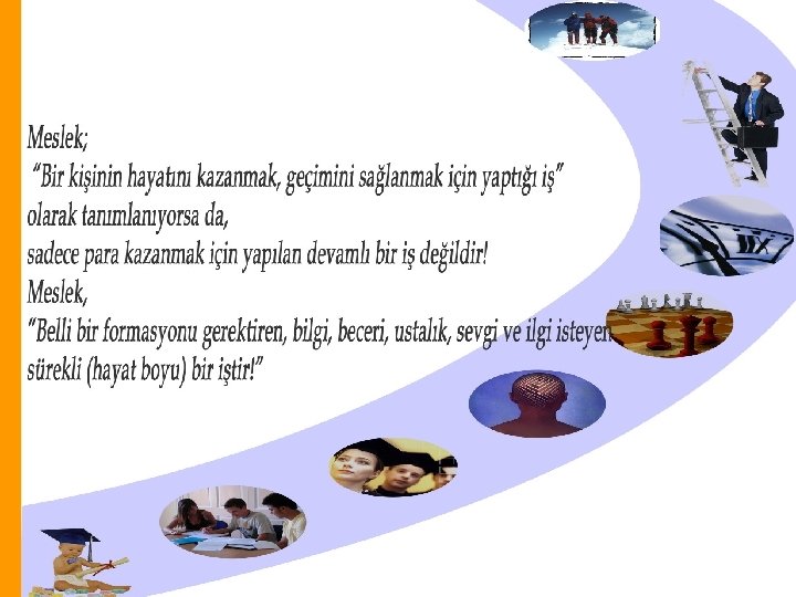 MESLEK SEÇİMİ Meslek, aynı zamanda yeteneklerimizi değerlendirmek ve toplum içinde yer edinmek için de önemli bir araçtır. Meslek doğru bir kararla seçilmişse bu ihtiyaçların daha üst düzeyde karşılanmasını sağlayabilir.