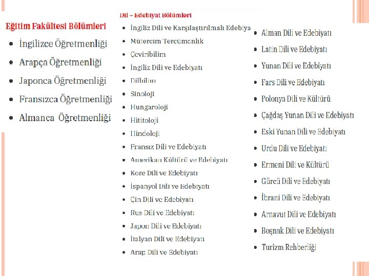 KÜLTÜR-EDEBİYAT MESLEKLERİ NELERDİR: Türk Dili Edebiyatı, Türkçe Öğretmenliği, Türkoloji Azerbaycan Dili ve Edebiyatı, Çağdaş Türk Lehçeleri Kürt Dili ve Edebiyatı, Zaza Dili ve Edebiyatı Süryani Dili ve Edebiyatı Çerkez Dili ve Edebiyatı, Kazak Dili ve Edebiyatı Hititloji, Sümerloji Halkbilim Tarih, Tarih Öğretmenliği