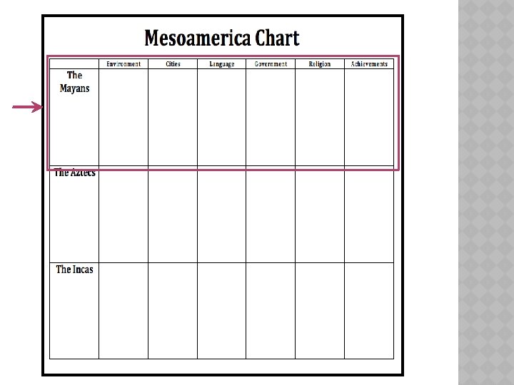 MESOAMERICA Outcome The Mayas CONSTRUCTIVE RESPONSE QUESTION Who Slides: 26 Download presentation MESOAMERICA Outcome: The Mayas CONSTRUCTIVE RESPONSE QUESTION ⦿Who were the Maya and what did they do? WHAT WILL WE LEARN? ⦿Environment ⦿Cities ⦿Language/Writing ⦿Economy ⦿Government ⦿Religion ⦿Achievements PEAK OF MAYAN CIVILIZATION ⦿Between 900 AD 250 - MESOAMERICA THE MAYAS ⦿Environment �S. Mexico �Yucatan Peninsula �Steamy jungles �Cool mountains YUCATAN BY SATELLITE MAYA CITIES THE MAYAS ⦿Cities �Tikal �Palenque �Chichen Itza TIKAL CHICHEN ITZA PALENQUE WATER CHANNELS THE MAYAS ⦿Lang/Writing �Most advanced writing system in Americas � 800 glyphs �Codex- records (only 3 exist today) MAYAN GLYPHS THE MAYAS ⦿ Economy �Cities were linked by trade: • Salt, flint, feathers, shells, & honey �Jade ornaments �Cacao beans used as currency THE MAYAS ⦿Gov’t �Rule by god-kings (theocracy) �Had city-states �Dynasties were important �Noble class near the top THE MAYAS ⦿Religion �Polytheistic �Blood offerings �Human sacrifice HUMAN SACRIFICE HUMAN SACRIFICE THE MAYAS ⦿ Achievements �Calendar • • System. 002% short of our calendar 2012? ? �Temple • IV 212 feet high �No iron tools or wheels THE MAYAS DECLINE ⦿ Mystery! ⦿ Environmental constraint causing political and social unrest? ⦿ Invasions? ⦿ Malnutrition? CONSTRUCTIVE RESPONSE QUESTION ⦿Who were the Maya and what did they do?