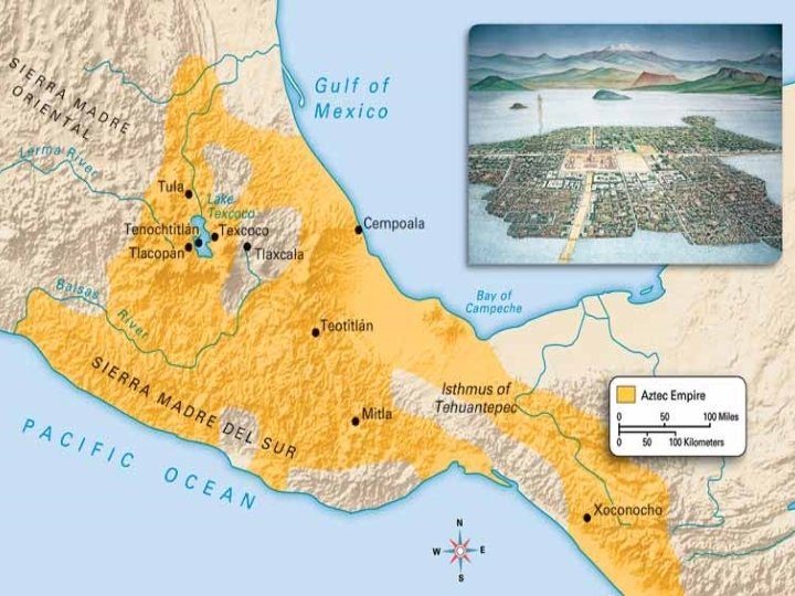 Aztec: Rise • 1200 -1521 • Sometime during the twelfth century A. D. • began a long migration to the Valley of Mexico • established their capital at Tenochtitlán – an island in the middle of Lake Texcoco (Mexico City) • Aztec power increased by taking neighbor’s land through war