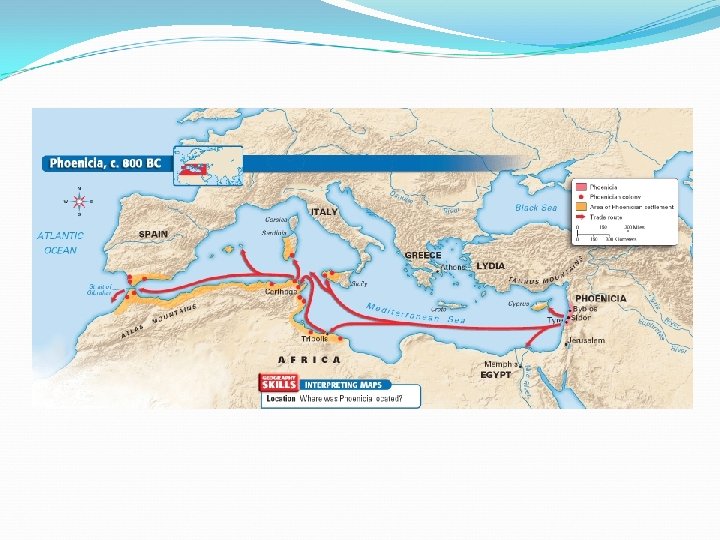 Main Idea 3: The Phoenicians built a trading society in the eastern Mediterranean region. Resources • Prized Cedar trees for timber • Accessed the sea for trade • Built great harbors Expansion of Trade • Sailed ships around the Mediterranean Sea • Founded several new colonies along the trade routes Alphabet • Recorded their activities • Made writing much easier for everyone • Is the basis for the English language • Became wealthy Video: Phoenician Alphabet (2: 51 minutes)