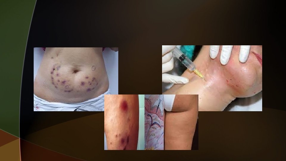 EFECTOS ADVERSOS u Dolor: u puede deberse a la punción o a la mezcla inyectada. Eritema: puede ir desde un eritema banal hasta un shock anafiláctico grave. u Reacciones vagales: el acto mesoterápico debe efectuarse siempre en posición de decúbito. u Lesiones mecánicas: en zonas anatómicas donde el trayecto del nervio es muy superficial, como la epicondílea, epitroclear, maleolar, etc. , pueden producirse lesiones mecánicas con la aguja. Cuando se efectúa el tratamiento mesoterápico muy rápido, no es rara la aparición de pequeños cortes lineales que cicatrizan dejando una lesión similar a un arañazo de gato. u Hematomas: su aparición nos indica excesiva profundidad en la puntura y/o modificaciones en los parámetros normales de la coagulación.