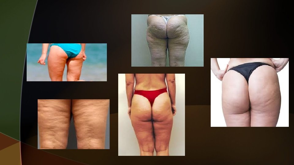 CELULITIS Y ADIPOSIDAD LOCALIZADA u También llamada, paniculosis, fibroedema genoide, lipoesclersis, lipodistrofia, paniculopatía edematofibroesclerótica (PEFE). u Conceptualmente se divide en dos criterios o dos tipos evolutivos diferentes: 1). Donde la alteración es una disposición morfológica constitucional, de implicancia estética, que le permite llevar una vida normal y no presentar sintomatología general. 2). Donde se debe a la acción de factores desencadenantes y/o agravantes que evolucionan hacia etapas más severas. Llevan a distintos grados de invalidez y es frecuente la presencia de síntomas generales.