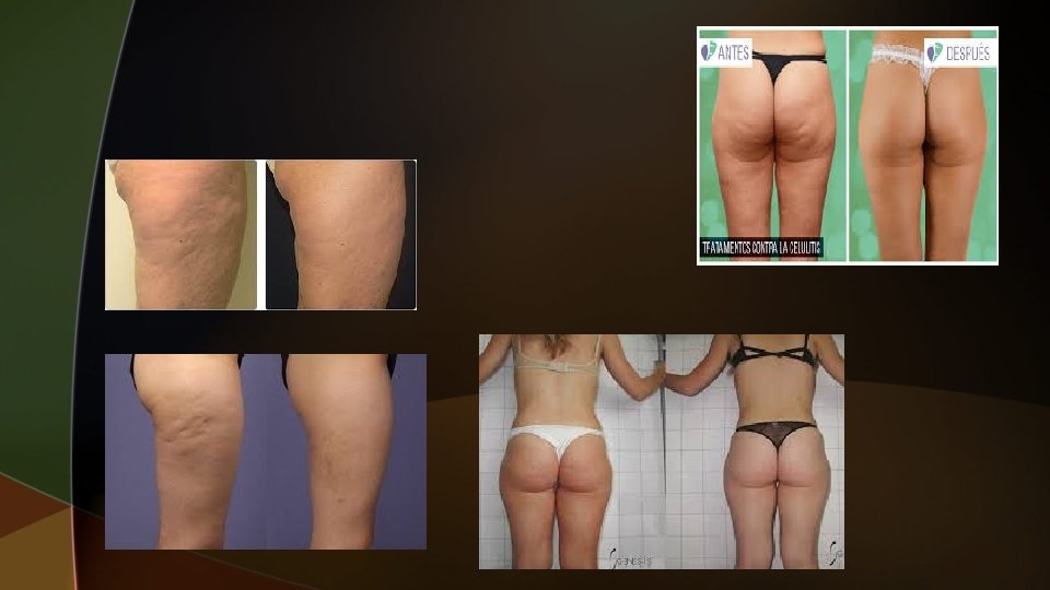 u. Lipolíticos en los estadios 1º, 2º, 3º y 4º. Reducen el volumen del adipocito hipertrófico con la consiguiente disminución del espesor del panículo adiposo. Los que actúan estimulando la adenil ciclasa: silicio y yohimbina. u Los que inhiben la acción de la enzima fosfodiesterasa: catecolaminas, triac, metilxantinas. Las enzimas lipolíticas: fosfatidilcolina (de aplicación intradérmica profunda). u