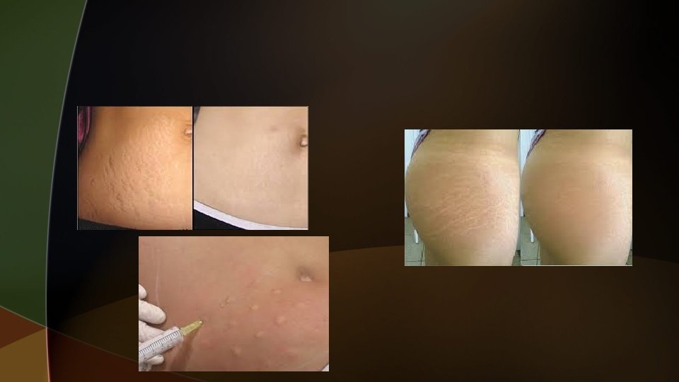 ESTRÍAS Y FLACCIDEZ u Son lesiones lineales, al comienzo rojo vinosas pero con el tiempo se hacen blanco-nacaradas o parduzcas debido a alteraciones de las fibras elásticas. u. A la palpación hay pérdida de la elasticidad de la piel con sensación de vacío. u TRATAMIENTO § MESOTERÁPICO DE ESTRÍAS Y FLACCIDEZ: Se usan para estrías: Silicio, X ADN, oligoelementos, PCSA, ácido hialurónico, ácido retinóico. Se usan para flaccidez: Silicio, PCSA, DMAE, argireline, X ADN.