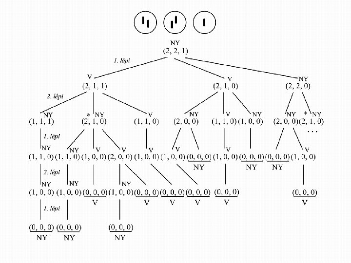 Nim �mindkét játékos nyerni akar �a játékfa minden levelén van egy címke – abban az adott végállapotban ki nyer? �(azaz a kezdő játékos szempontjából nyerő e vagy vesztő az adott végállapot) �ha a kezdő játékos szempontjából nyerő az adott állás NY címke jelöli �ha a kezdő szempontjából vesztő V címke jelöli