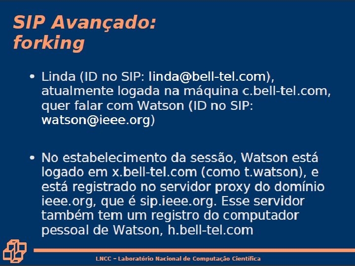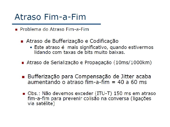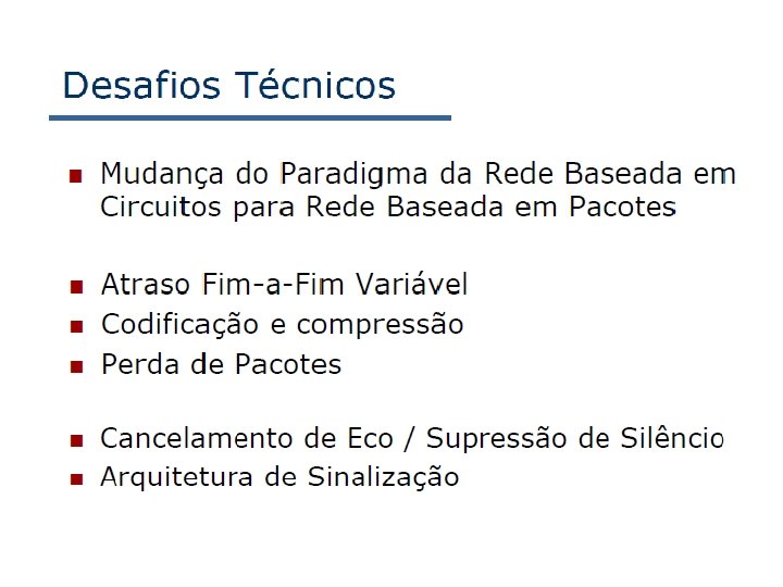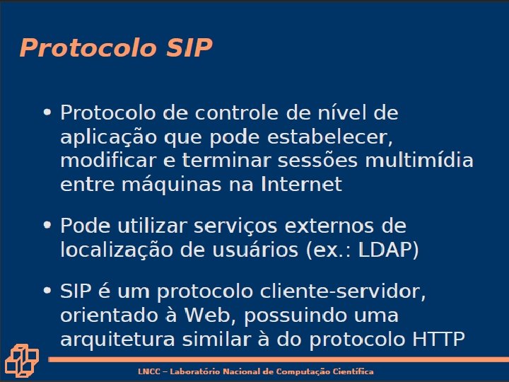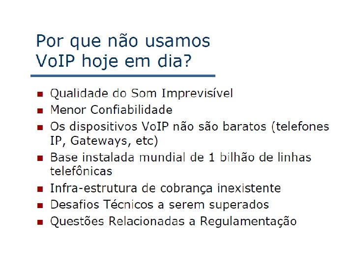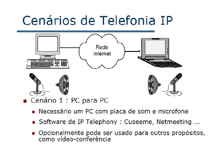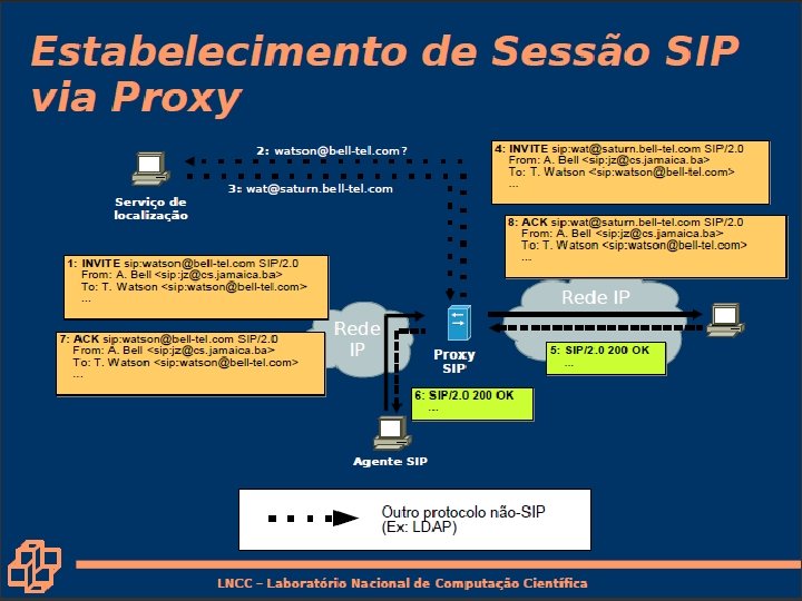 Tradução de nome e localização de usuário • Chamador deseja chamar o chamado, mas possui apenas o nome ou o endereço de e-mail do chamado. • Precisa obter o endereço IP do hospedeiro atual do chamado: – usuário se desloca – protocolo DHCP – usuário possui diferentes dispositivos IP (PC, PDA, dispositivo no automóvel) 7: Redes Multimídia • Resultado pode depender de: – hora do dia (trabalho, casa) – chamador (não deseja que o chefe lhe chame em casa) – status do chamado (chamadas enviadas para correio de voz quando o chamado já estiver falando com alguém) Serviço provido por servidores SIP: • Entidade registradora SIP • Servidor proxy do SIP 7 a-25