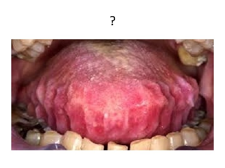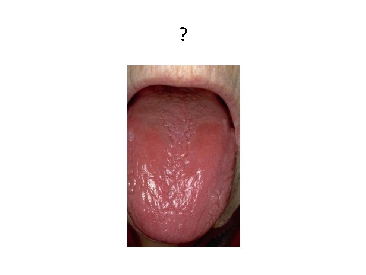 Glossitis • • Tongontsteking Branderig gevoel Glad en gezwollen tongrug Donkerrode verkleuring Problemen bij slikken, kauwen en praten Droge mond Keelpijn Ademhalingsproblemen