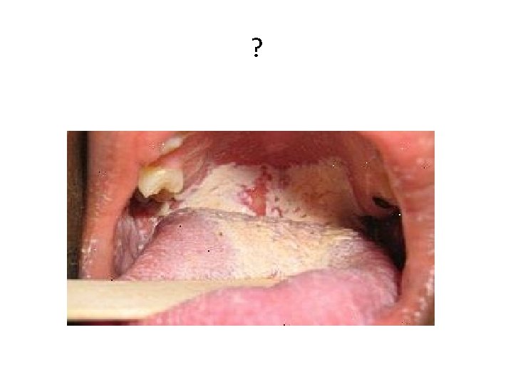 Candidose • Candida albicans • Verstoring evenwicht in de mond ØMedicatie ØVerzwakking immuunsysteem ØXerostomie ØZwangerschap ØRoken ØDragen versleten gebitsprothese ØTekort vit B en ijzer