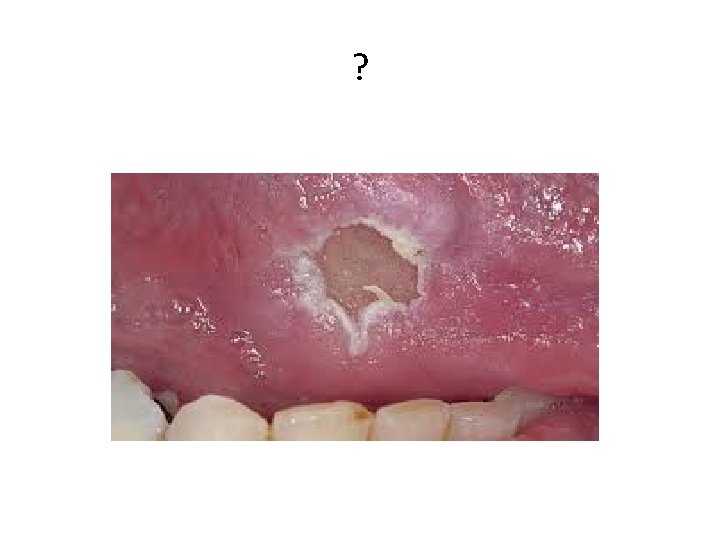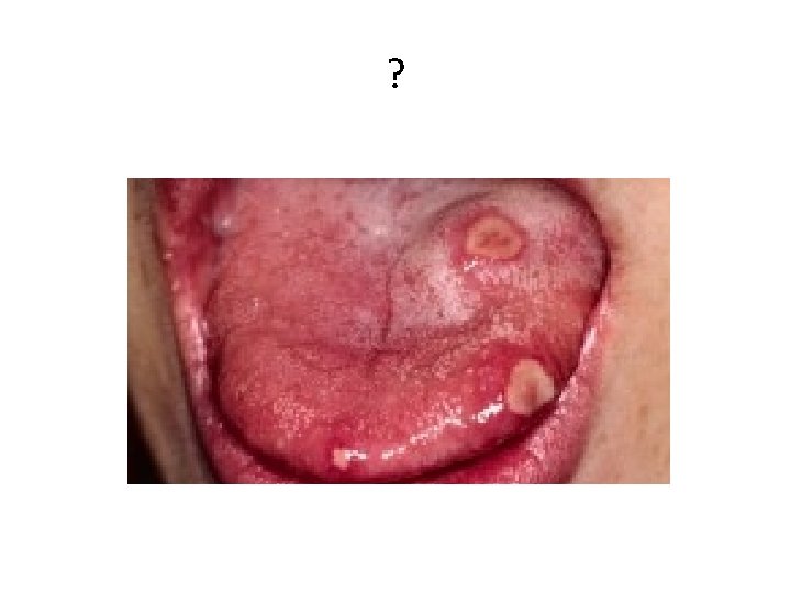Afte • Verheven witte ulcus met felrode randen • Lippen, tong, verhemelte, wang, gingiva • Pijn ØPoetsen ØEten • Alleen verlichting van klachten • Waarschijnlijke veroorzaker herpes virus