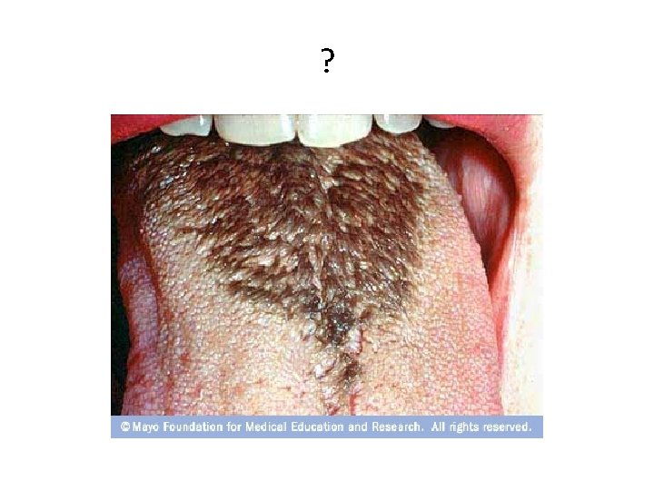 Lingua villosa • • 0, 5% van de bevolking Slechte mondhygiëne Antibioticagebruik Gebruik chloorhexidine mondspoeling