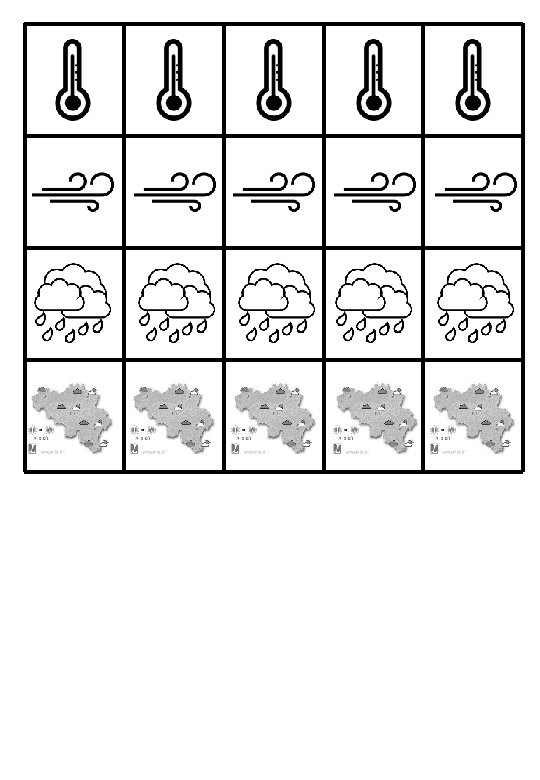 INHOUD: - 36 kaarten - 1 weerwijzer - 25 weerchips WEERWIJZER - SPELREGELS VOORBEREIDING: De kaarten met de vragen leg je per categorie met het symbool omhoog in het midden van de tafel. Je hebt dan 4 stapels. Ook de weerwijzer en de weerchips leg je in het midden van de tafel. SPELVERLOOP: De speler die begint geeft een slinger aan de wijzer. De leerling rechts van hem pakt een kaarten van het stapeltje van het gedraaide weersymbool. Deze leerling leest de vraag voor. . • Juist antwoord: leerling verdient de bijbehorende weerchip. Daarna is het aan de leerling die net de vraag heeft voorgelezen. • Fout antwoord: Het juiste antwoord wordt niet voorgelezen, de leerling krijgt geen weerchip en is het aan de leerling die de vraag net heeft voorgelezen. Stel je draait het weersymbool waarvan je de weerchip al hebt. Dan beantwoordt je opnieuw een vraag van dat symbool. • Juist antwoord: je behoudt de weerchip. • Fout antwoord: je geeft de weerchip terug. Om de vragen te beantwoorden, mag je je cursuspapieren gebruiken (p 104 -107). Hiervoor krijg je telkens 15 sec. Er wordt een klok geprojecteerd, de andere leerlingen houden de tijd in het oog. EINDE SPEL: De doel is om als eerste de 4 weerchips te behalen. Jij wordt de nieuwe weerman/-vrouw! De andere spelers spelen verder tot ook zij de 4 weerchips hebben.