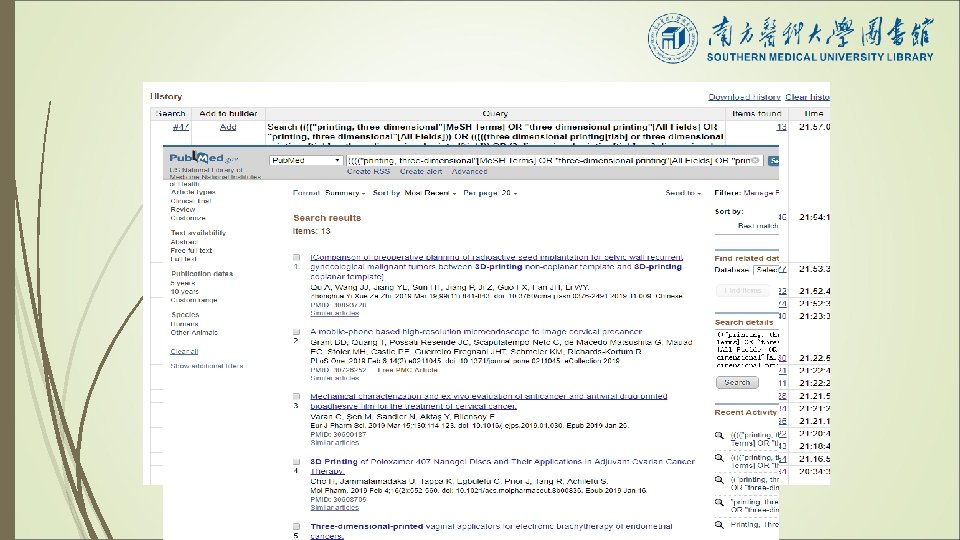 检索式构建与实施: 3 D打印 “printing, three-dimensional”[Me. SH Terms] OR three dimensional printing[TIAB] OR three dimensional printings[TIAB] OR three dimensional printed[TIAB] OR 3 dimensional printings[TIAB] OR 3 dimensional printed[TIAB] OR 3 -d printings[TIAB] OR 3 -d printed[TIAB] OR 3 d printings[TIAB] OR 3 d printed[TIAB]