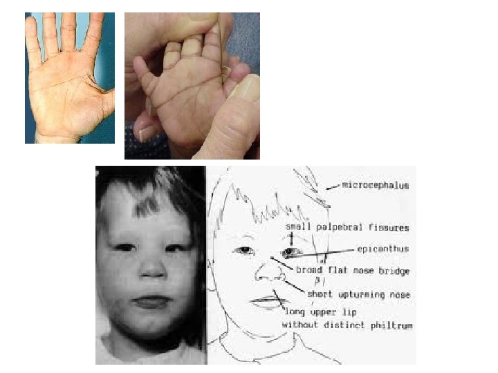 They may come with flattened mid-face, indistinct philtrum, low nasal bridge and single palmar crease. Small chin is called micrognathia