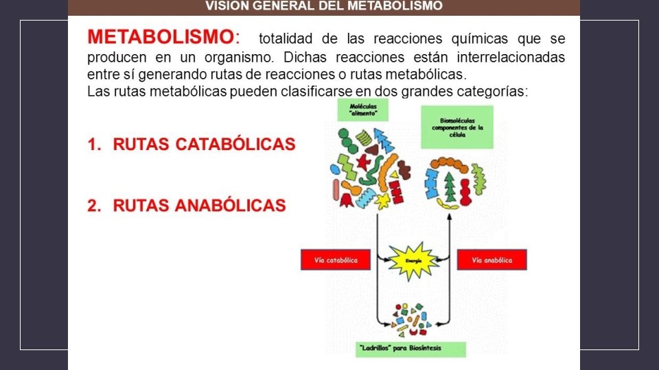 El metabolismo es esencial para el organismo, tiene como objetivos fundamentales la producción de energía y la síntesis de biomoléculas (proteínas, azúcares, lípidos, nucleótidos).