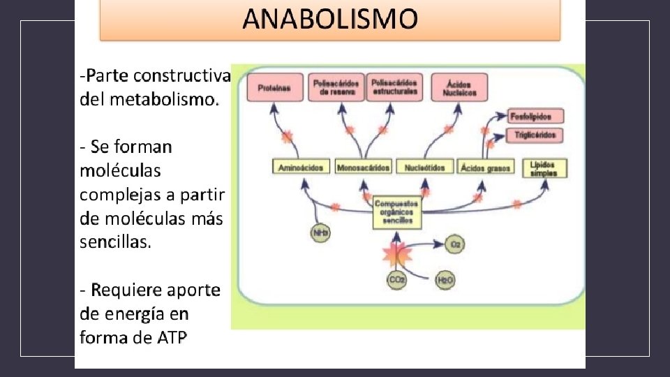Anabolismo: El anabolismo es el conjunto de procesos metabólicos constructivos en los que la energía liberada por el catabolismo se utiliza para sintetizar moléculas complejas.