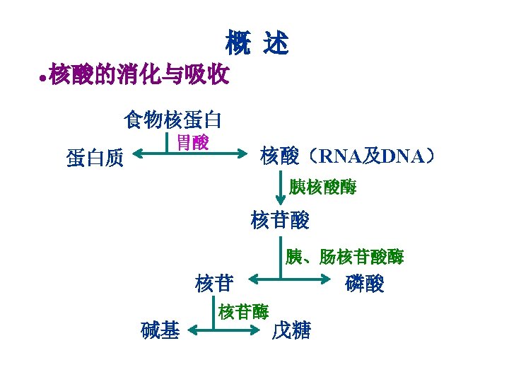 Summarise l Digestion and absorption of nucleic acid Nucleoprotein Nucleic acid(RNA, DNA) Protein Nuclease Nucleotidase Phosphate Nucleosidase Base Ribose