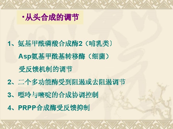 • 从头合成的调节 • Regulation of De novo synthesis of Purine Nucleotides 调节方式:反馈调节和交叉调节 _ _ _ + + 腺苷酸代 R-5 -P PRPP合成酶 酰胺转移酶 PRPP PRA _ ATP IMP 琥珀酸 XMP _ AMP ADP ATP GMP GDP GTP _ IMP 腺苷酸代 琥珀酸 + GTP XMP ATP AMP ADP ATP +GMP GDP GTP _ 目录