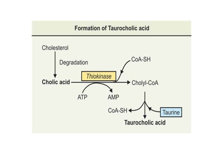 - Formation of taurine: cysteine is utilized in the formation of taurine, which combines with cholic acid ( obtained from degradation of cholesterol in liver) to form bile acid "taurocholic acid ".