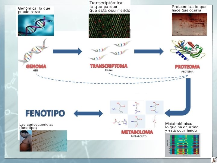 Metabolómica a nivel sanitario La metabolómica, a nivel clínico y epidemiológico, proporciona una oportunidad única para poder observar las relaciones entre el genotipo y el fenotipo, así como las respuestas de un organismo en relación con los factores ambientales y el estilo de vida Fundamentalmente, proporciona información sobre los factores que influyen en las enfermedades, permitiendo entender su patogénesis, obtener un diagnóstico temprano, una terapia adecuada y la monitorización de la misma