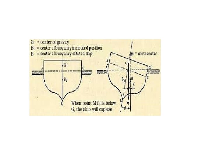 Metacentric Height Ø The metacentric height is a measure of the statical stability of floating Body such as ship. Ø The distance between centre of gravity G and metacentre M i. e. GM is metacentric height on rolling the stability body by a small angle along the longitudinal or transverse axis. Ø For a ship to be stable, the metacentric height must be positive. Ø The magnitude of metacentric height is obtained as under: (a) If G is above B, MG = BM – BG (b) If G is below B, MG = BM + BG Ø The magnitude of the righting Couple = W (MG) Sin θ which determines the stability of ship. To avoid large no. of oscillation, it is desirable that the metacentric height should not be very large. It is therefore, a compromise has to be made between these two.