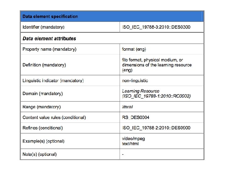 Making metadata for ISO 24751 The steps are: – Analyse and determine the needs of the client base (use domain expertise) – Sort the properties (domain and metadata expertise) – Represent the properties using the Resource Description Framework – Provide examples of encoding of metadata – Develop cross-walks where necessary