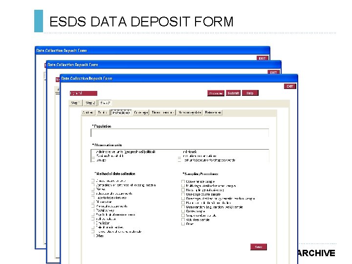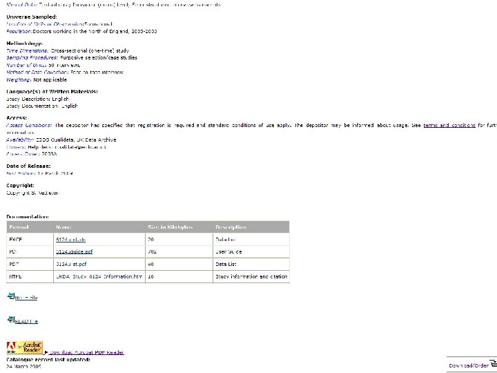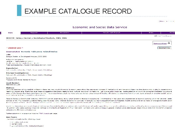 CATALOGUE METADATA FOR ESDS ………………………………………………………………. . • UK Data Archive / ESDS collects and creates structured metadata for each archived dataset from various sources: • data deposit form (www. esds. ac. uk/aandp/create/depform. asp) • documentation provided by data owner • admin metadata created during ingest data processing • data listing, variable lists compiled during processing • processing details and information gathered in ‘readme’ file for users • keywords from HASSET thesaurus - keyword index covers data elements and concepts • Standardised elements + controlled vocabularies = consistent search and retrieval ………………………………………………………………. . … UK DATA ARCHIVE