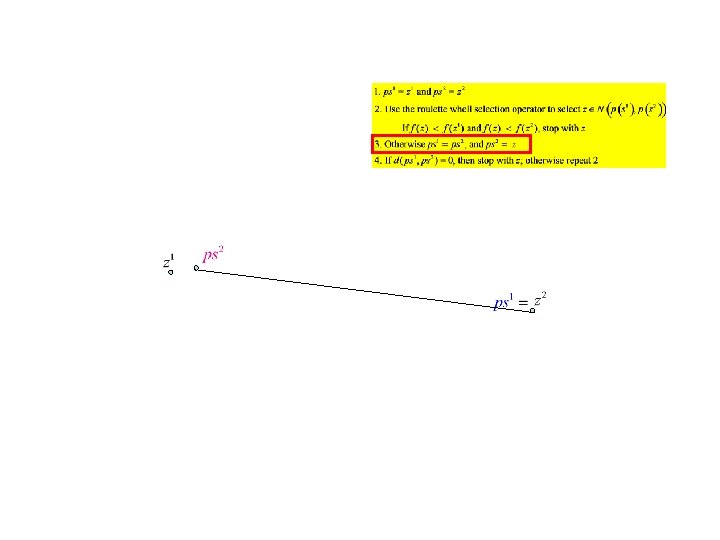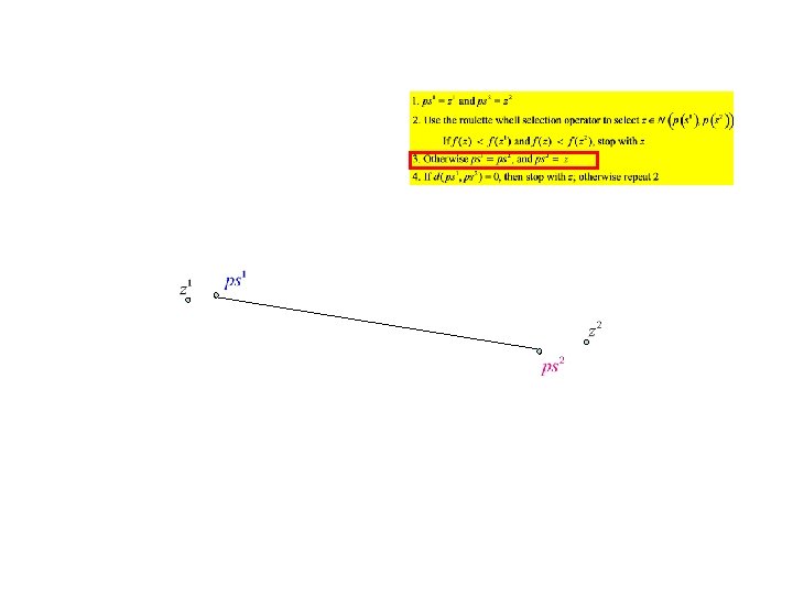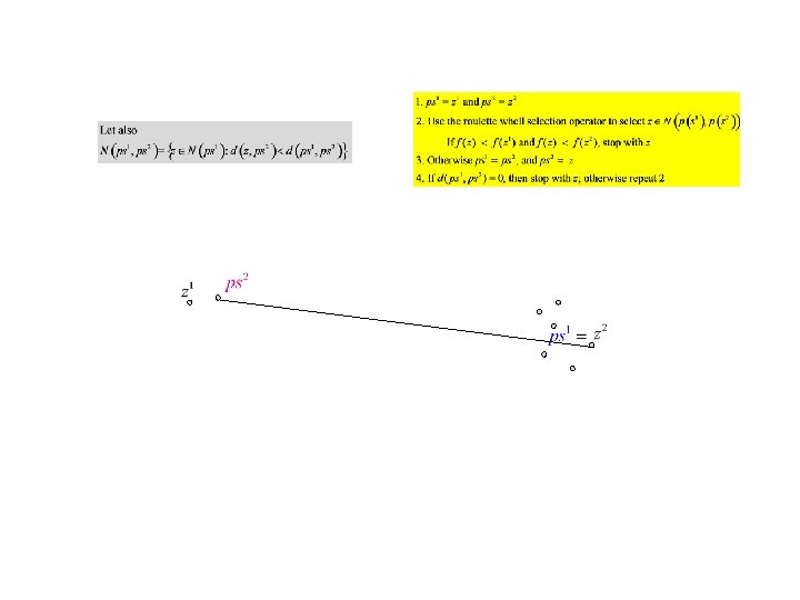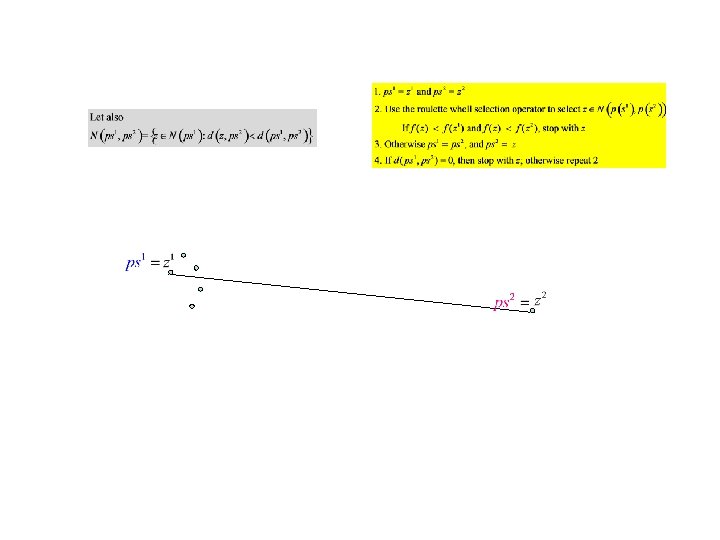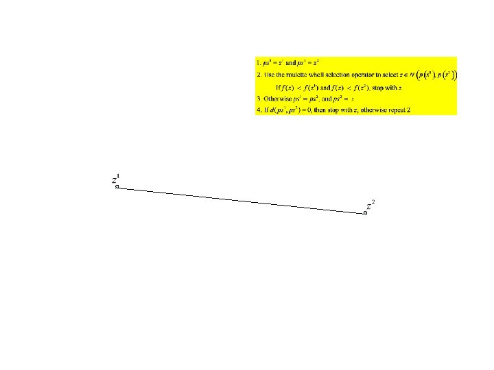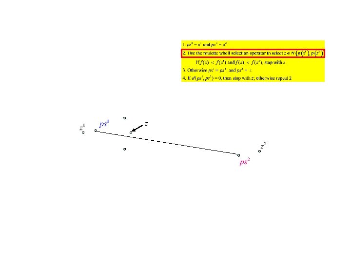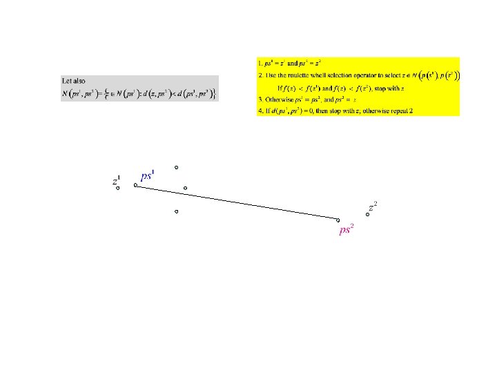 Two points crossover • The two points crossover generates two offspring-solutions from the two parent-solutions z 1 = [ z 11, z 21, …, zn 1] z 2 = [ z 12, z 22, …, zn 2] as follows: i) Select randomly two positions (indices) μ, ν, 1 ≤ μ ≤ ν ≤ n. ii) Then the offspring-soltions are specified as follows: oz 1 = [ z 11, …, zμ-11, zμ 2, …, zν 2, zν+11, …, zn 1] oz 2 = [ z 12, …, zμ-12, zμ 1, …, zν 1, zν+12, …, zn 2] Hence the offspring oz 1 (offspring oz 2) has components μ, μ+1, …, ν of parent 2 (parent 1), and the rest of the components are the corresponding ones of parent 1 (parent 2)