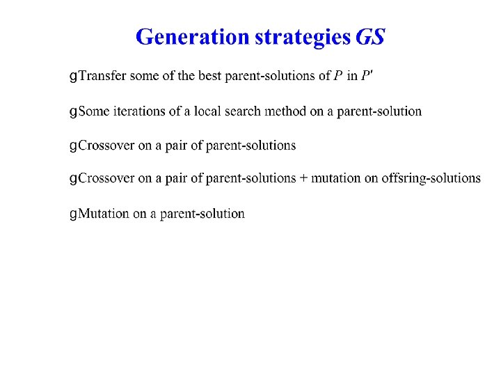 Mutation operator • Mutation operator is an individual process to modify offspring-solutions • In traditional variants of Genetic Algorithm the mutation operator is used to modify arbitrarely each componenet zi with a small probability: For i = 1 to n Generate a random number β [0, 1] If β < βmax then select randomly a new value for zi where βmax is small enough in order to modify zi with a small probability • Mutation operator simulates random events perturbating the natural evolution process • Mutation operator not essential, but the randomness that it introduces in the process, promotes diversity in the current population and may prevent premature convergence to a bad local minimum