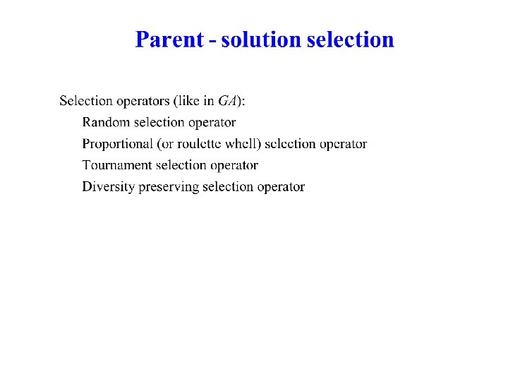 Random selection operator • Select randomly each parent-solution from the current (entire) population • Properties: Very straightforward Promotes diversity of the population generated