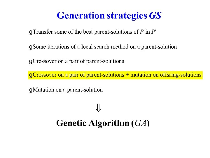 Genetic Algorithm (GA) • Population based algorithm • At each generation three different operators are first applied to generate a set of new (offspring) solutions using the N solutions of the current population P: selection operator: selecting from the current population parent-solutions that reproduce themselves crossover (reproduction) operator: producing offspring-solutions from each pair of parent-solutions mutation operator: modifying (improving) individual offspring-solution • A fourth operator (culling operator) is applied to determine a new population of size N by selecting among the solutions of the current population and the offspring-solutions according to some strategy