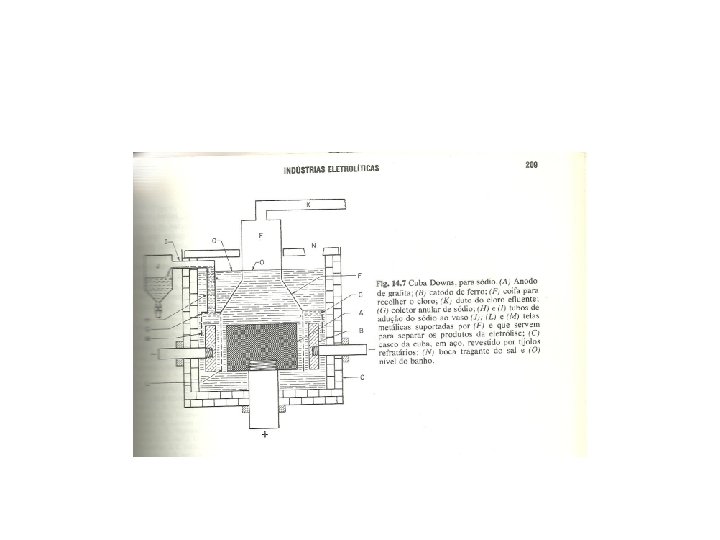Célula de Downs • Recipiente cilíndrico de aço, medindo 2, 5 m de altura e 1, 5 m de diâmetro, revestido de tijolos refratários. O ânodo é um bastão de grafite rodeado por um cátodo de aço fundido que se encontra no centro do cilindro. • Uma tela de metal separa os dois eletrodos, impedindo que o sódio formado se combine com o cloro. • O sódio formado sobre nada, menos denso que o eletrólito
