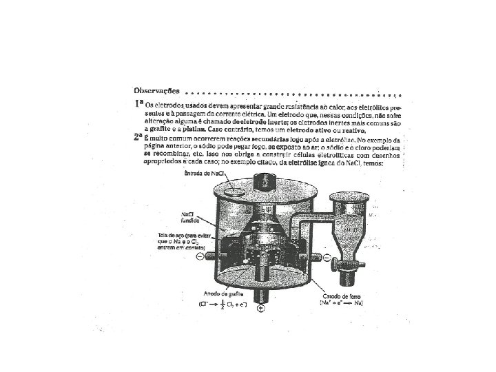 equações • • No ânodo, polo positivo (oxidação ). 2 Cll. Cl 2( g) + 2 e. No cátodo, polo negativo ( redução ). 2 Na+l + 2 e 2 Nas • Global 2 Cl-l+ 2 Nas + Cl 2 ( g )