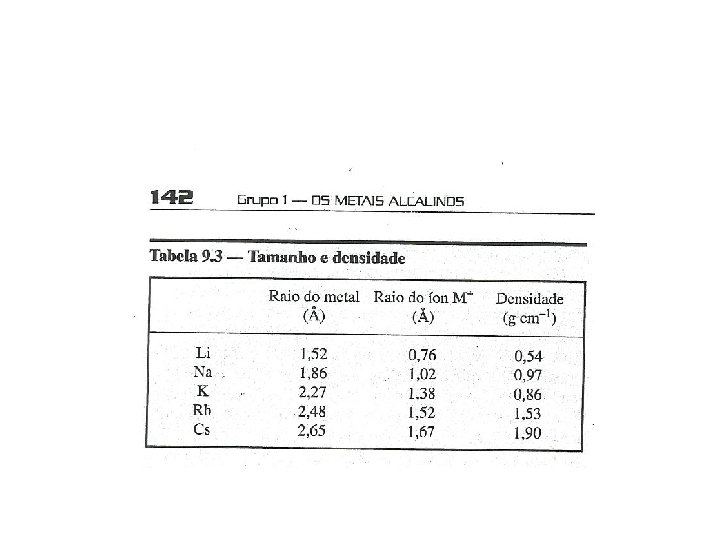 Estrutura cristalina dos metais, dureza e energia de coesão • Estrutura cúbica de corpo centrado. • Os átomos são mantidos unidos na rede cristalina por ligações metálicas moderada – • mente fortes envolvendo os elétrons de valência. • O calor de atomização diminui do lítio ao césio, significando que a força da ligação metálica diminui do lítio ao césio.